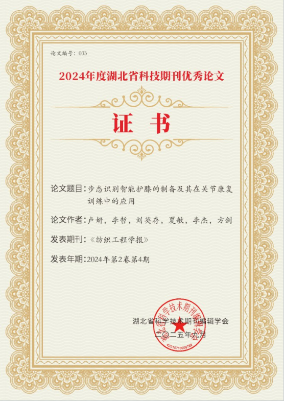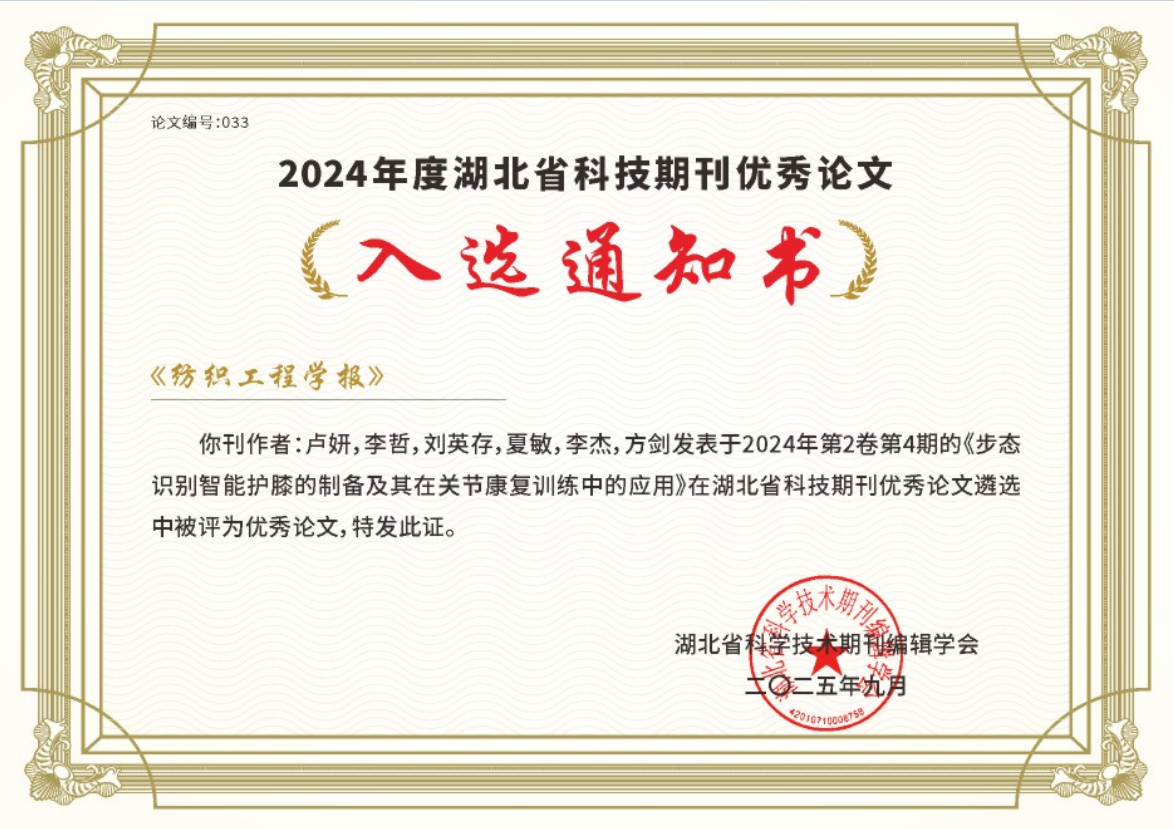 《纺织工程学报》论文入选2024年度湖北省科技期刊百篇优秀论文获奖证书